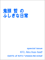 毎日更新! 鬼頭 哲 ブログ 「うさぎのえさ」 はこちら >>news ■KITO, Akira Brass Band! 「easygoing!」 PVをYouYubeにて公開しました。映像は「Rock on the Rock! '09」のライヴ、制作はSoundvisionです。(9/1) ■8月28日発売の雑誌「サックス&ブラス・マガジン」に鬼頭哲の連載「ウチの普通は1.5玉」が掲載されています。(8/28) ■KABB! オリジナルTシャツ、できました。絵柄は2パターン。鬼頭もときどき着ているので、気になる方は声をかけてください。 ![]() ■5月28日発売の雑誌「サックス&ブラス・マガジン」に、鬼頭のインタヴューが掲載されています。また、楽器ケース紹介、オススメアルバム紹介など、本誌のいろいろなところに登場しています。 ![]() →詳しくはこちら(ブラスブログ) もちろん、鬼頭哲の連載「ウチの普通は1.5玉」も掲載されています。(5/28) ■KABB !(鬼頭 哲 ブラスバンド)のマキシシングル「easygoing!」が発売中です。鬼頭は作曲・指揮はもちろん、レコーディンからマスタリングまで、すべてのディレクションを行なっています。(3/21) ![]() ■2月28日発売の雑誌「サックス&ブラス・マガジン」に鬼頭哲の連載「ウチの普通は1.5玉」が掲載されています。(2/28) ■鬼頭哲が音楽監修で協力した、チューバとユーフォニアムによる覆面デュオ「TubamanShow」のCDが発売中です。(12/25) ![]() 試聴&お買い求めは こちら ■12月10日発売の雑誌「ブラストライブ」に、11/9の鬼頭 哲 ブラスバンドのライヴ記事が見開き2ページで掲載されています。(12/10) ■「渋さ知らズ」2007年ヨーロッパツアー・パリ公演の模様を収録したライヴCD『巴里渋舞曲』が地底レコードより好評発売中です。全国レコード店、公演会場、通信販売などでお求め下さい。(11/16) ![]() 「鬼頭 哲 ブラスバンド」のDVD、『鬼頭 哲 ブラスバンド の 十月の絶唱』が好評発売中です。全国レコード店、公演会場、通信販売などでお求め下さい。 特集ページはこちら ![]() 「東京中低域」のDVD、『Tokyo-chutei-iki Live in London』、CD『十一種』など、好評発売中です。全国レコード店、公演会場、通信販売などでお求め下さい。 DVD特集ページはこちら 鬼頭 哲 責任編集によるミニブック、『鬼頭 哲 の ふしぎな日常』が好評発売中です。 ![]() <特集 鬼頭 哲 ブラスバンド の 風景> ・鬼頭哲インタヴュー 「僕らの音楽の行方」 ・バンマス独断による全メンバー紹介 ・対談 加藤日名子×照喜名俊典 ・オリジナル楽曲 全曲紹介 ・酔いどれ対談 鬼頭哲×三原智行 ・寄稿 Scenery of 'KITO, Akira Brass Band!' ◆鬼頭 哲 日々雑記 特選「うさぎのえさ 2001-2006」 ◆書きおろしコラム 「ブラスバンドをやろう?」 音楽には「コトバハイラナイ」、それは詞の否定ではなく、言葉で「うたをうたおう」という宣言でもあった。サックスで唄いあげ、ステージ上にいくつもの風景画を描いてきた鬼頭哲にとって、言葉は音楽と同様に、「大切な何か」を伝えるための方法だった。 旗揚げから5年、リーダー鬼頭哲が語る「鬼頭ブラス」の原風景とは? 多種多様なメンバーがいま見ている景色とは? その行先に拓ける新たな風景とは? 鬼頭ブラスの来し方を散策し、行く末を占う、徹底研究! 2001年から毎日更新しつづけられてきた鬼頭哲の日々雑記「うさぎのえさ」の、特別よりぬき版を収録。めくるめく「グチとボヤキとふしぎな日常」に仕掛けられた発見とは? 再び楽器を持とうと思うアナタや、ブラスバンドをはじめようと考えるアナタに贈る、特別書きおろしコラムも収録。 鬼頭ファンも、鬼頭ブラスファンも、必携の一冊! メールでご注文を受け付けています。 【お名前】、【送付先ご住所】、【電話番号】、【ご希望商品】、【数量】を明記の上こちらからお申し込み下さい。メール受信後、担当者から注文確認メールを返信いたします。送料(実費)、お振込み手数料はお客様のご負担となります。ご了承下さい。送信後5日経っても注文確認メールが届かない場合は送信事故の可能性がありますので再度ご連絡をお願いします。 >>過去の情報については こちら |